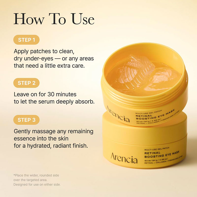 The skin around the eyes is thinner, more delicate, and often the first place to show signs of fatigue and ageing. That is why Arencia created the ARENCIA Retinal Boosting Eye Mask (60 pcs) — a targeted treatment designed to hydrate deeply, smooth fine lines, and restore elasticity with every use.