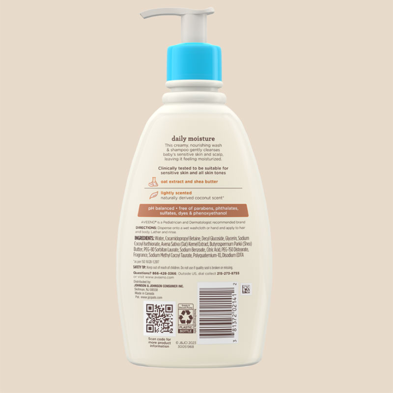 Gently cleanse baby’s sensitive skin & scalp. This creamy, 2-in-1 moisturizing baby body wash & shampoo is formulated with oat extract & shea butter with a gentle, naturally derived coconut scent*.