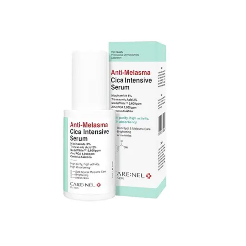 CARE:NEL Anti-Melasma Cica Intensive Serum is a potent brightening and soothing treatment designed to target melasma, dark spots, and uneven skin tone. Formulated with 5% Niacinamide and 2% Tranexamic Acid, it helps reduce hyperpigmentation and prevent melanin formation. The inclusion of Centella Asiatica Extract and Madecassoside provides calming effects, while 1,000ppm Zinc PCA aids in sebum regulation and skin barrier reinforcement. This lightweight, non-greasy serum absorbs quickly, making it suitable for daily use on all skin types.