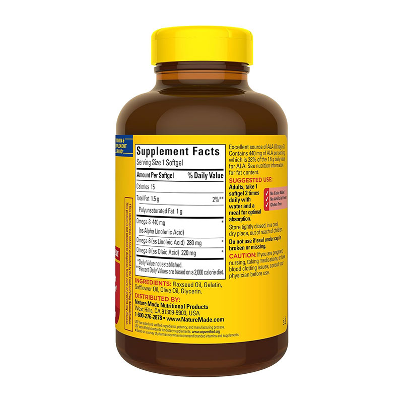 Boost your heart health with Nature Made Triple Omega 3 6 9 150 Softgels. These powerful supplements harness fish, flaxseed, safflower and olive oils, the most potent sources of omega 3, 6, and 9. The robust formulation provides substantially more essential omegas than fish oil softgels, for a whopping 1302 mg of omega-3, 828 mg of omega-6 and 510 mg of omega-9. The softgels contain no artificial colors, preservatives, flavors, yeast, starch or gluten. The fish oil is purified to remove all traces of mercury and heavy metals. The softgel formulation is easy to swallow and absorbs quickly. Each bottle contains 180 softgel tablets.